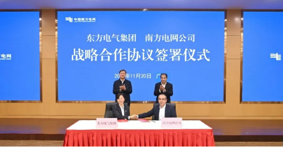 11月20日,中國東方電氣集團有限公司與中國南方電網有限責任公司在廣州簽署戰略合作協議。東方電氣集團黨組書記、董事長羅乾宜,南方電網公司黨組書記、董事長孟振平,共同見證協議簽署。集團公司黨組成員、總會計師呂雙與南方電網公司黨組成員、副總經理吳小辰代表雙方簽訂協議。